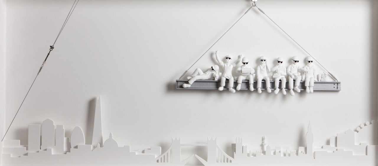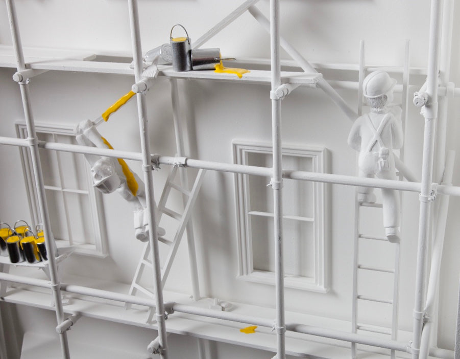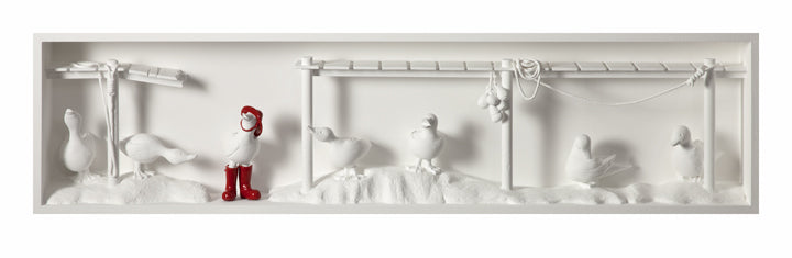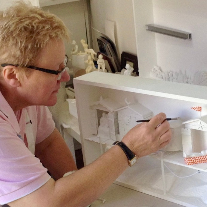 Each of Lesley’s sculptures encapsulate a moment in time, involving the careful play of light with shadow, in which the focus of each piece is a seemingly simple, but dramatic, splash of colour. All with her trademark touch of humour.